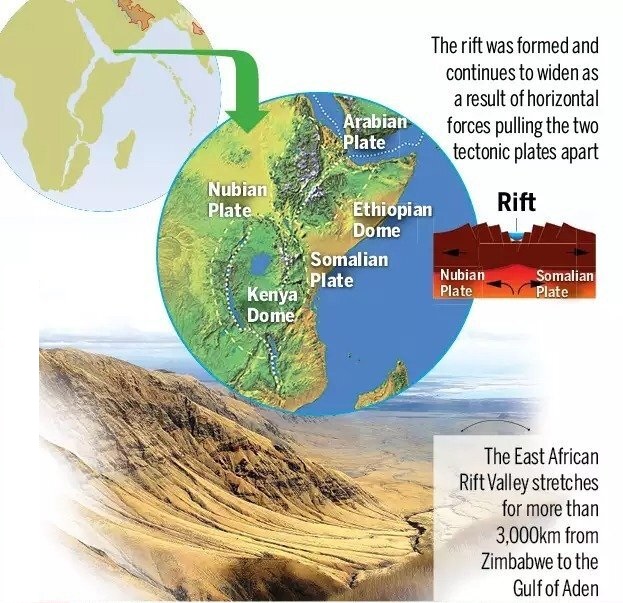 East African Rift Valley divides the African plate into two parts: the Somali and Nubian plates.