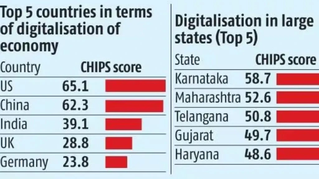 Context: In the SIDE 2024 report, the US ranks first with a score of 65 and China a close second with 62, India is third with a score of 39. India is the third largest digitised country in the world after the US and China, a just released report “State of India's Digital Economy (SIDE) 2024” says.