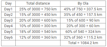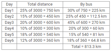 Directions : Study the following pie chart and bar chart carefully and answer the questions given beside. A person covers a total distance of 3000 km in 6 days, by bus, by Ola, and by Uber. Study the pie chart and bar graph to answer these questions. The percentage of total distance travelled in 6 different days.