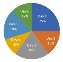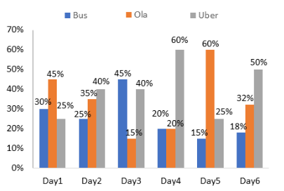 Directions : Study the following pie chart and bar chart carefully and answer the questions given beside. A person covers a total distance of 3000 km in 6 days, by bus, by Ola, and by Uber. Study the pie chart and bar graph to answer these questions. The percentage of total distance travelled in 6 different days.