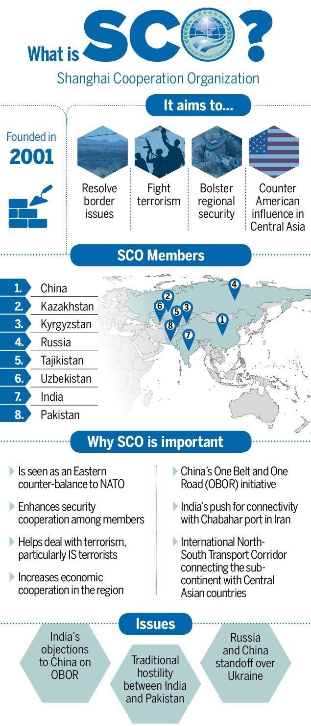 Members: Russia, China, the Kyrgyz Republic, Kazakhstan, Tajikistan, Uzbekistan, India and Pakistan