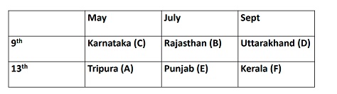 Six events take place over three months two events in each month on the dates 9th and 13th. The three months are May, July and September. Event A occurs on a prime numbered date and in the month with 31 days. Two events take place between A and Uttarakhand. Kerala event takes place immediately after Uttarakhand. As many events take place before C as after Kerala. One event takes place between C and Rajasthan. No event takes place between Rajasthan and E. The event E does not take place in Rajasthan. Tripura event takes place before Punjab. Event C does not happen in Tripura. Event D takes place after B but before F. One event takes place in Karnataka.