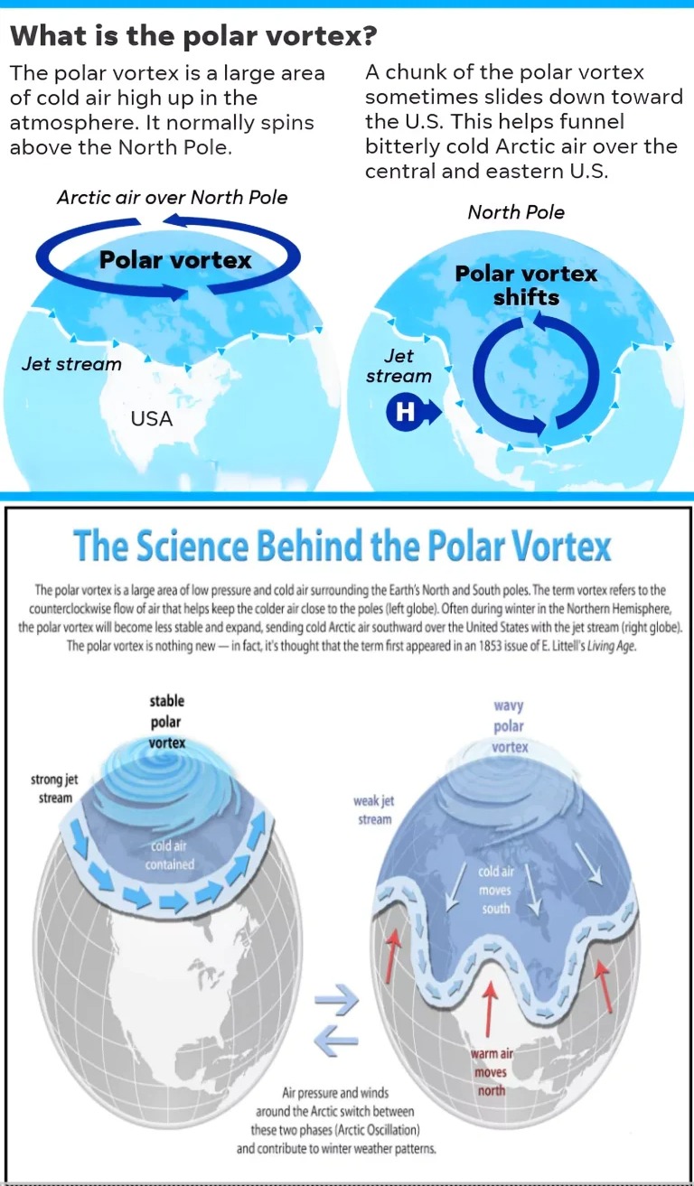 • When the polar vortex weakens, cold Arctic air moves south, bringing freezing temperatures to regions like the US, Europe, and Asia.