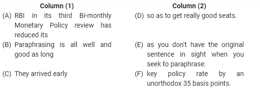 Explain Checking A-F: RBI in its third Bi-monthly Monetary Policy review has reduced its key policy rate by an unorthodox 35 basis points. The above sentence is correct both grammatically and contextually. Checking B-D: Paraphrasing is all well and good as long as you don't have the original sentence in sight when you seek to paraphrase. The above sentence is correct both grammatically and contextually as well. Checking C-E: They arrived early so as to get really good seats. The above sentence too is correct both grammatically and contextually. Option B is hence the correct answer.
