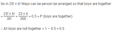 Follwoing the common explanation we get ; Number of student in group A = 20 + 10 + 24 = 54 Number of student in group B = 16 + 30 + 10 = 86 Number of student in group C = 20 + 10 + 40 + 20 = 90 Total number of student in class V = 30 Number of boys in class V = 6 Number of girls in class V = 24 Total number of arrangement = 30P30 = 30! Consider all the boys as one we have 24 girl + 1 boys = 25 person which can be arranged in 25! Ways i.e. 25! But 6 boys can also be arranged in 6! Ways among themselves