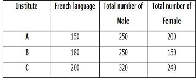Directions (): Study the following information carefully and answer the questions given below. Three institutes A, B, and C teach two different languages French and German.The given table shows the number of students learning the French language and the total number of males and females studying in these three different institutes.