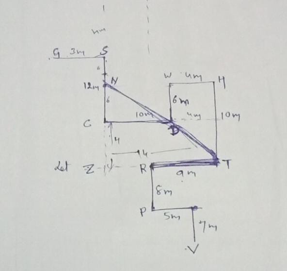 A person from point G walks towards north for 3m to reach point S, where he turns to his right and walks for 12m to reach point C. From point C, he turns to his left and walks 10m to reach point D and turns to his left again to walk for 6m and reach point W. Then he walks 4m after turning to his right and reaches point H where he again turns to his right and walks 10m to reach point T. At point T, he turns to his right and walks 9m to reach point R where he turns to his left and walks 8m to reach point P. Then he walks 5m to reach point J after taking a left turn. Finally, he turns to his right and walks 7m to reach point V.