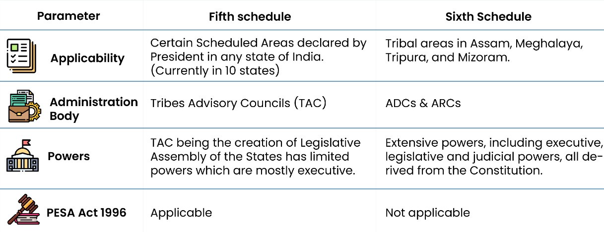 Fifth Schedule: This schedule applies to ‘scheduled areas’ primarily inhabited by tribal populations.