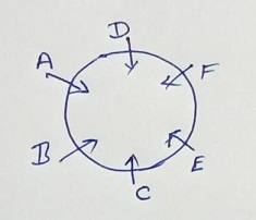 A, B, C, D, E, and F are standing in a circle talking, facing the centre of the circle. E is standing immediate right to C. D is standing at the third position towards the left of C.