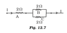 Three 2 ? resistors, A, B and C, are connected as shown in Figure 12.7. Each of them dissipates energy and can withstand a maximum power of 18W without melting. Find the maximum current that can flow through the three resistors ? ( 2- marks )