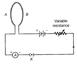 A circular loop placed in a plane perpendicular to the plane of paper carries a current when the key is on.
