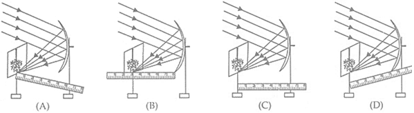 Four students A, B, C and D performed the experiment to determine the focal length of a concave mirror by obtaining the image of a distant tree on a screen. They measured the distances between the screen and the mirror as shown in the diagrams given below: