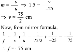 If a man’s face is 25 cm in front of concave shaving mirror producing erect image 1.5 times the size of face, focal length of the mirror would be