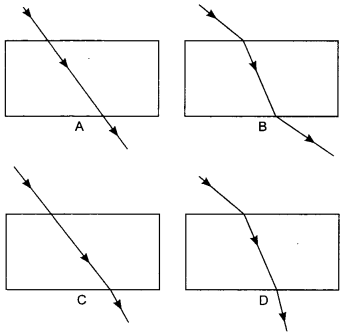 The path of a ray of light coming from air passing through a rectangular glass slab traced by four students are shown as A, B, C and D in figure. Which one of them is correct?