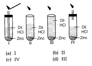 Four set ups as given below are arranged to identify the gas evolved when dilute hydrochloric acid was added to zinc granules. Which is the most appropriate set up?