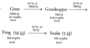 According to 10% law, only 10% of the energy entering a particular trophic level of organisms is available for transfer to the next higher trophic level. In this food chain, at the 4th trophic level, only 5 kJ energy is available to the snake. So, the energy available at the producer level will be 5000 kJ.