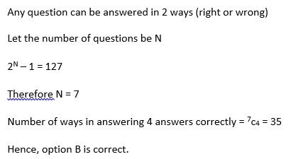 An objective test with all the questions mandatory to be answered can be attempted in 127 ways such that the student gets atleast one question right. Find the number of ways in which he can answer 4 questions correctly.