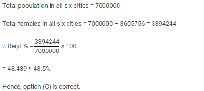 The total number of females in all six cities together is what percent of the total population of all six cities together? (Answer in approximate value)