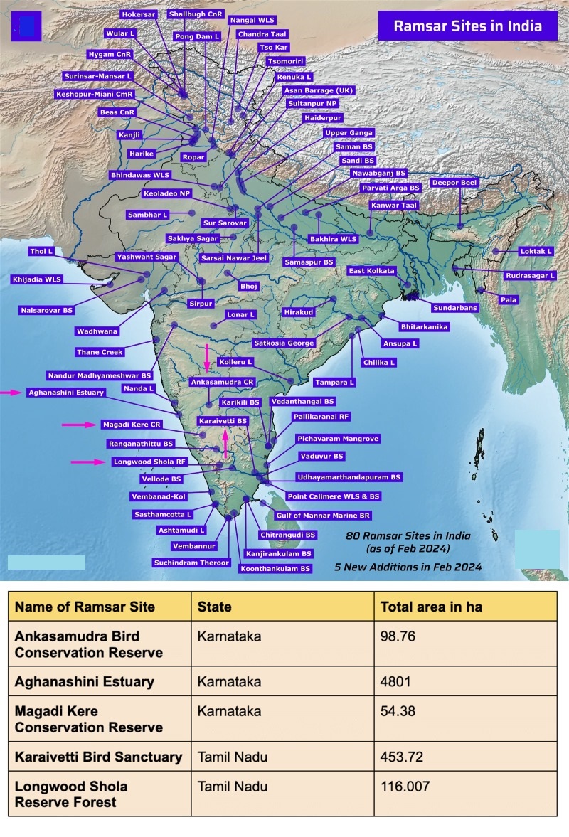 Context: India has recently expanded its list of Ramsar Sites, by adding 5 more wetlands on the eve of World Wetlands Day 2024, which brings the total number of Ramsar sites in India to 80.