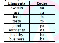 information carefully and answer the questions given below: In a certain code language ‘sweets are tasty food’ is coded as ‘sa ra fa ta’ ‘food are good nutrients’ is coded as ‘na fa ga ra’ ‘nutrients are healthy’ is coded as ‘ha ra na’ ‘healthy sweets good business’ is coded as ‘sa ha ba ga’