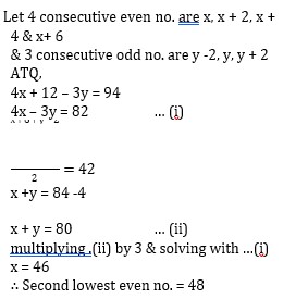 Sum of 4 consecutive even numbers are 94 more than the sum of 3 consecutive odd numbers and if average of largest even no. & smallest odd no. is 42. Then find the 2nd lowest even no.?