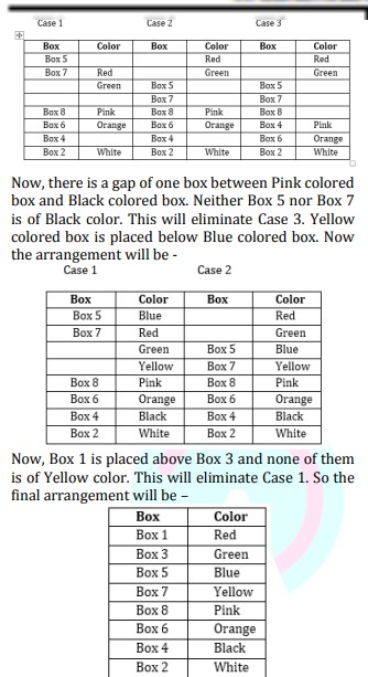 Eight boxes numbered as Box 1, Box 2 and so on till Box 8 are placed one above another (not necessarily in the same order). They all are of different colors viz. Green, Blue, Red, White, Orange, Yellow, Black and Pink.