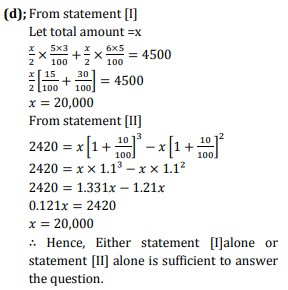 [I] If jagriti invested half of the amount in Yes Bank at 5% p.a. for 3years and half the amount in Kotak Bank at 6% p.a. for 5 year, she got total Rs4500 as Simple Interest.