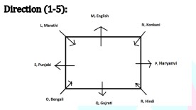 Eight friends L, M, N, O, P, Q, R and S are sitting around a square table in such a way that four of them sit at four corners of the square while four sits in the middle of each of the four sides. The ones who sit at the four corners face the center while those who sit in the middle of the sides face outside. Each of them like different languages, viz. Marathi, Hindi, English, Bengali, Konkani, Punjabi, Haryanvi and Gujrati.