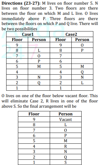 Direction : Study the following information carefully and answer the question given belowEight people viz. L, M, N, O, P, Q, R and S live in a building of nine different floors. One floor is vacant. The ground floor is numbered as 1, the floor just above it is numbered as 2 and so on till top floor which is numbered as 9 (but not necessarily in the same order). Two floors are there between the floors on which M and L live. M lives on floor number 5. O lives immediately above P. N lives on floor number 3. There are three floors between P and Q. R lives in one of the floor above S. O lives on one of the floor below vacant floor.