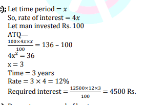 A man invested some amount in a scheme at S.I. and got 36% of more amount in return. If in the scheme, ratio between numeric value of rate of interest to time period is 4 : 1 then find the interest received by the man when he made an investment of Rs 12,500 in the same scheme at the same rate and for the same period of time.