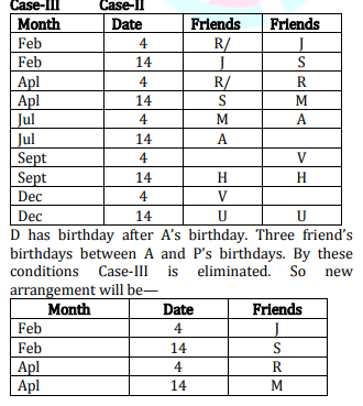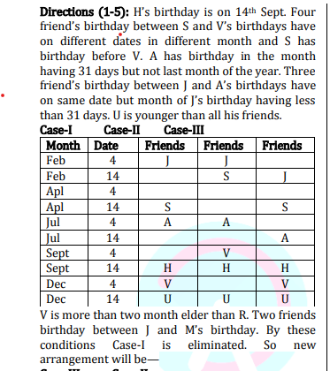 H’s birthday is on 14th Sept. Four friend’s birthday between S and V’s birthdays have on different dates in different month and S has birthday before V. A has birthday in the month having 31 days but not last month of the year. Three friend’s birthday between J and A’s birthdays have on same date but month of J’s birthday having less than 31 days. U is younger than all his friends
