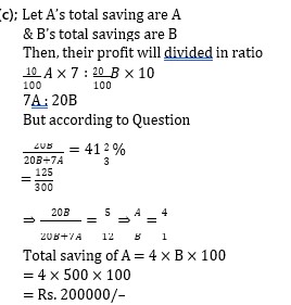 A and B started business, where A invested his 10% savings and B invested 20% of his saving for 7 months and 10 months respectively. If B get 41 ?% of total profit, find the total saving of A, given that 1% of B’s savings is Rs. 500