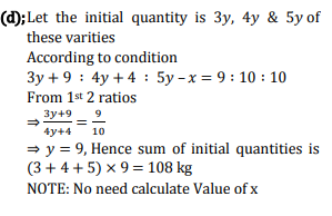 There are three varities of sugar with their quantity in the ratio of 3 : 4 : 5. If 9 kg of first variety and 4 kg of second variety are added to their respective quantity and x kg of 3rd type is removed from it, then final ratio becomes 9 : 10 : 10. Find the sum of initial quantities of these varieties.