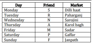 Directions : Study the following information carefully and wer the questions given below: Seven friends A, N, S, M, P, R, and F are going for shopping to different markets of Delhi viz. Sadar, Karol bagh, Dilli haat, Gaffar, Sarojini, Janpath and Paharganj, (but not necessarily in the same order) on different days of the same week viz. Monday, Tuesday, Wednesday, Thursday, Friday, Saturday and Sunday. Starting from Monday. N goes to Sarojini but does not go on Friday. S goes on Monday but does not go to Janpath. P goes to Gaffar on Saturday. The one, who goes on Tuesday goes to Paharganj. M goes to Sadar. F goes on Sunday. A does not go to Paharganj. The one who goes on Thursday goes to Karol bagh.