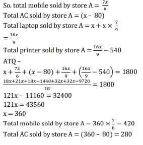Total laptop sold by store A is 77 7 9 % more than total fan sold by store A and total printer sold by store A is 540 less than total laptop sold by store A. Total fan sold by store B is 120 more than total fan sold by store A, while total laptop sold by store B is 12 1/2 % more than total laptop sold by store A. Ratio of total mobile, AC & printer sold by store B is 26 : 23 : 11 respectively.