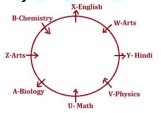 Y likes Hindi and sits 2nd to the right of U, who likes math. Z sits opposite to Y. U and Y face opposite direction of each other. W likes arts and sits immediate left of Y. V sits 2nd to left of W. W and Z face same direction with each other. W and Z likes same subject. The one, who likes physics sits 3rd to the right of Z. The one who likes English is not just near to Z. B and V face the same direction as Z faces. A doesn’t like chemistry. B doesn’t sit just near to U and opposite to U. X is not an immediate neighbor of U. W does not face opposite to center.
