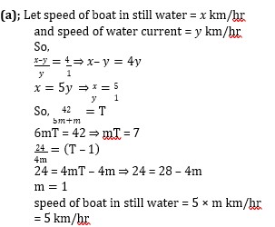 Ratio of upstream speed of a boat to speed of river current is 4 : 1. It covers 42 km in downstream in T hours and 24 km in upstream in (T – 1) hours. Find speed of boat in still water.