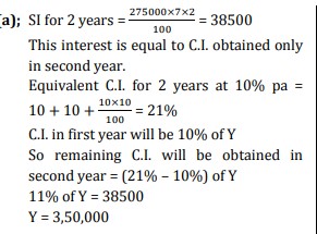Veer invested Rs. 275000 on S.I. at the rate of 7% p.a. for 2 years and Rs ‘Y” on CI at the rate of 10% pa for 2 years. If total SI obtained in two years is equal to CI obtained only on second year then, find ‘Y’