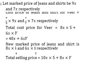 Veer purchases 5 jeans and Y shirts whose marked price is in the ratio 9 : 7 at a discount of 11 1 9 % and 14 2 7 %. Veer marked up jeans and T-shirt by 25% and 33 1 3 % respectively on the price at which he bought them and sold them at new marked price. If total profit percent for him is 29 6 11 % then find ‘Y’