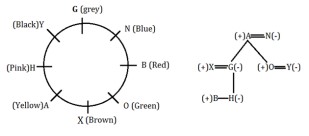 Eight people A, B, G, H, N, O, X and Y are member of family. Among them four are males and four are females. There are three husbands, three wives, two daughters, and two sons in the family. Each member of the family likes different color i.e. Yellow, Red, Blue, Brown, Black, Green, Grey and Pink. They all are sitting around a circular table facing the centre. No male like Blue. Y likes Black and is married to the one who likes Green. A is father of G and O. O, who is a male likes Green. A and B do not sit adjacent to each other. All females sit together. H likes Pink and is sitting second to the left of her father. H is daughter of G. G sits second to the right of her son. B sits between one male and one female. The one who likes Grey is married to the one who likes Brown and neither A nor B likes Brown. N likes Blue and is sitting between the one who like Red and the one who like Grey. X does not like grey. X is father of B and is sitting between two male members. Son and Daughter-in-law of A faces each other.