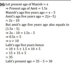 Present age of Amit is 50% more than Manish’s present age while 5 years ago Amit’s age was twice than that of Manish’s age at that time. Five years hence, sum of ages of Manish and Amit is equal to Lalit’s age at that time, then find present age of Lalit?