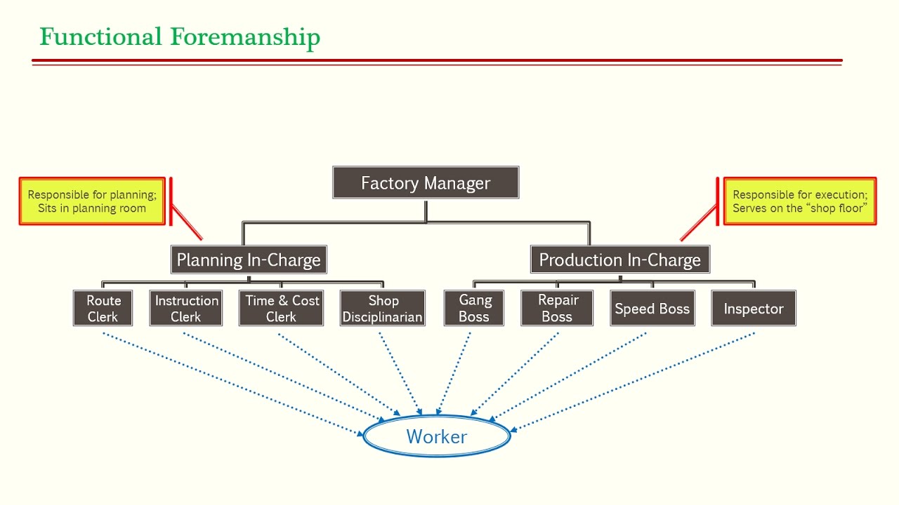Taylor advocated separation of planning and execution functions. This concept was extended to the lowest level of the shop floor. It was known as functional foremanship. Under the factory manager there was a planning incharge and a production incharge. Under planning incharge four personnel namely instruction card clerk, route clerk, time and cost clerk and a disciplinarian worked. These four personnel would draft instructions for the workers, specify the route of production, prepare time and cost sheet and ensure discipline respectively. Under Production incharge, personnel who would work were speed boss, gang boss, repair boss, and inspector. These respectively were responsible for timely and accurate completion of job, keeping machines and tools etc., ready for operation by workers, ensure proper working condition of machines and tools and check the quality of work. Functional foremanship is an extension of the principle of division of work and specialisation to the shop floor.