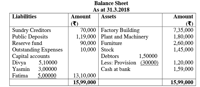 Divya, Yasmin and Fatima are partners in a firm, sharing profits and losses in 11:7:2 respectively. The balance sheet of the firm as on 31st March 2018 was as follows: