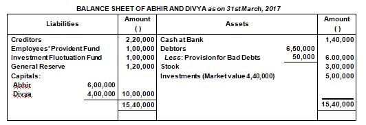 On 31st March, 2017, the Balance Sheet of Abhir and Divya, who were sharing profits in the ratio of 3 : 1 was as follows: