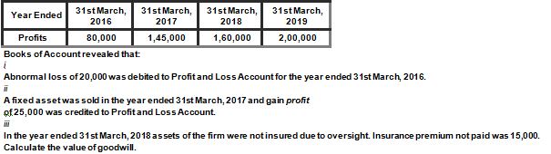 Q11.Sumit purchased Amit's business on 1st April, 2019. Goodwill was decided to be valued at two years' purchase of average normal profit of last four years. The profits for the past four years were