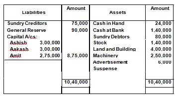 Q22.Ashish, Aakash and Amit are partners sharing profits and losses equally. The Balance Sheet as at 31st March, 2019 was as follows: