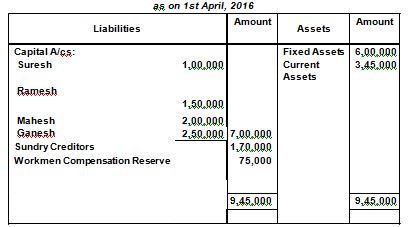 Q31.Suresh, Ramesh, Mahesh and Ganesh were partners in a firm sharing profits in the ratio of 2 : 2 : 3 : 3. On 1st April, 2016, their Balance Sheet was as follows: