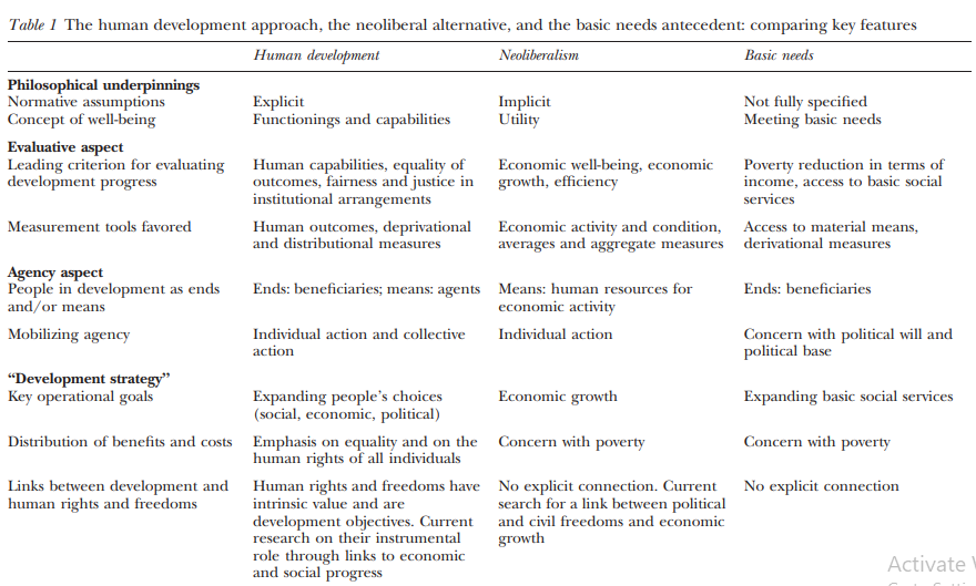 The differences between the human development approach, the neoliberal alternative, and the human development approach’s precursor, the basic needs approach, are summarized in Table 1.