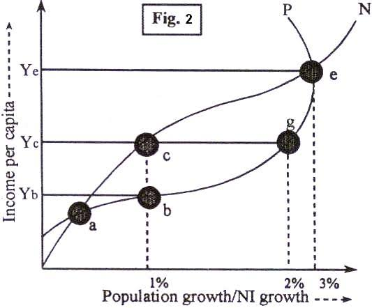 Here the curve N represents that increase in per capita income which equalizes the increase in population to increase in national income while the curve P shows the growth rate of population at different levels of per capita. We start with point 'a' where the economy is in equilibrium at subsistence level. Here neither income nor population increases. If per capita is increased till Yb, the population growth rate and increase in national income are of 1%. If the level of per capita income is Yc, the growth of population is greater than growth rate of national income. Ycg > Ycc or 2% > 1%. Therefore, the need is to increase per capita income in such a way that increase in national income is more than increase in population. Therefore, if per capita income increases more than Ye, the population growth starts declining. At point e, the population growth rate is 3% per annum which is the maximum possible growth rate of population on biological grounds. Thus according to Leibenstein, the Ye is the minimum critical level of per capita income which is necessary for economic growth.