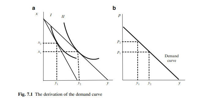 For example, when the price for good y is p2 individuals want the combination of goods (x2, y1), when the price of good y falls to p1, then consumers would move to a higher indifference curve and attain the combination (x1, y2), and so forth. If we plot these different combinations of optimal prices on the axes of Fig. 7.1b we generate a demand curve with a negative slope indicating the inverse relationship between price and quantity demanded of good y.